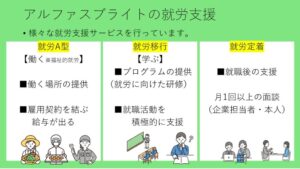 障がい者支援事業を行っているアルファスブライトでは、障がいをお持ちの方の就労を通した自立をサポートしています。