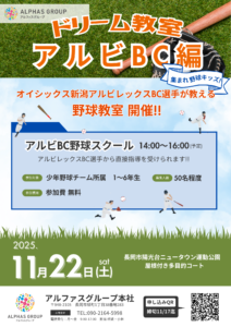 アルファスグループでは、2025年11月22日(土)、長岡市陽光台ニュータウン運動公園にて、オイシックス新潟アルビレックスBC選手が教える野球教室を開催いたします。