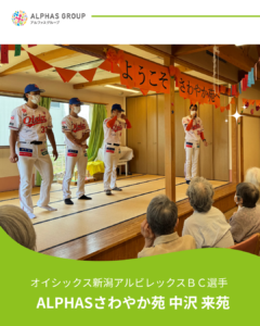 このたび、ALPHASさわやか苑 中沢にオイシックス新潟アルビレックスBCより “高橋駿臥選手”、”山田龍青選手”、”伴在汰文選手”の3名がご来苑くださいました。