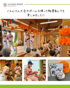 当日は、選手の皆さまとご利用社の皆さまで、脳の活性化を目的とした手遊びや、ボールを使用したレクリエーションを行い、交流を深めました。