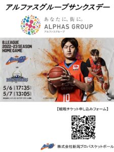 5月6日(土)7日(日)シティホールプラザアオーレ長岡で開催されます「B.LEAGUE2022ー23シーズンB1リーグ 第36節 新潟アルビレックスBB VS 信州ブレイブウォリアーズ」がアルファスグループサンクスデーとして開催されることとなりました。