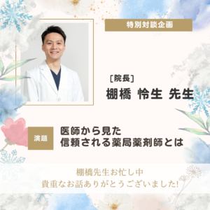 当日のプログラムのなかでは、見附たなはしクリニック院長の棚橋怜生先生をお招きして「医師から信頼される薬局・薬剤師とは」を演題に、ご講演をいただきました。