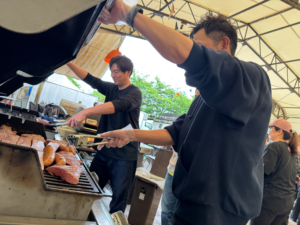 バーベキュー大会では、普段家庭では見られない大きなグリルでリブロースやチキンレッグをはじめ釜焚きの与板産コシヒカリに加えてソフトドリンク・アルコールの飲み放題があり、豪華な食べきれないほどの素材を焼いて楽しみました。