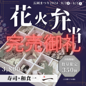 寿司・和食 一の「長岡まつり花火弁当」は8月2日、3日ともに、たくさんのご注文を頂き、完売させていただきました。
