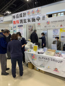 アルファスグループブースでは体脂肪・基礎代謝量・筋肉量などを測定できる体組成計測定や、障がい者就労支援サービス 福祉ラボアルファスブライトで製造された商品販売、サンプルの配布等を行います。