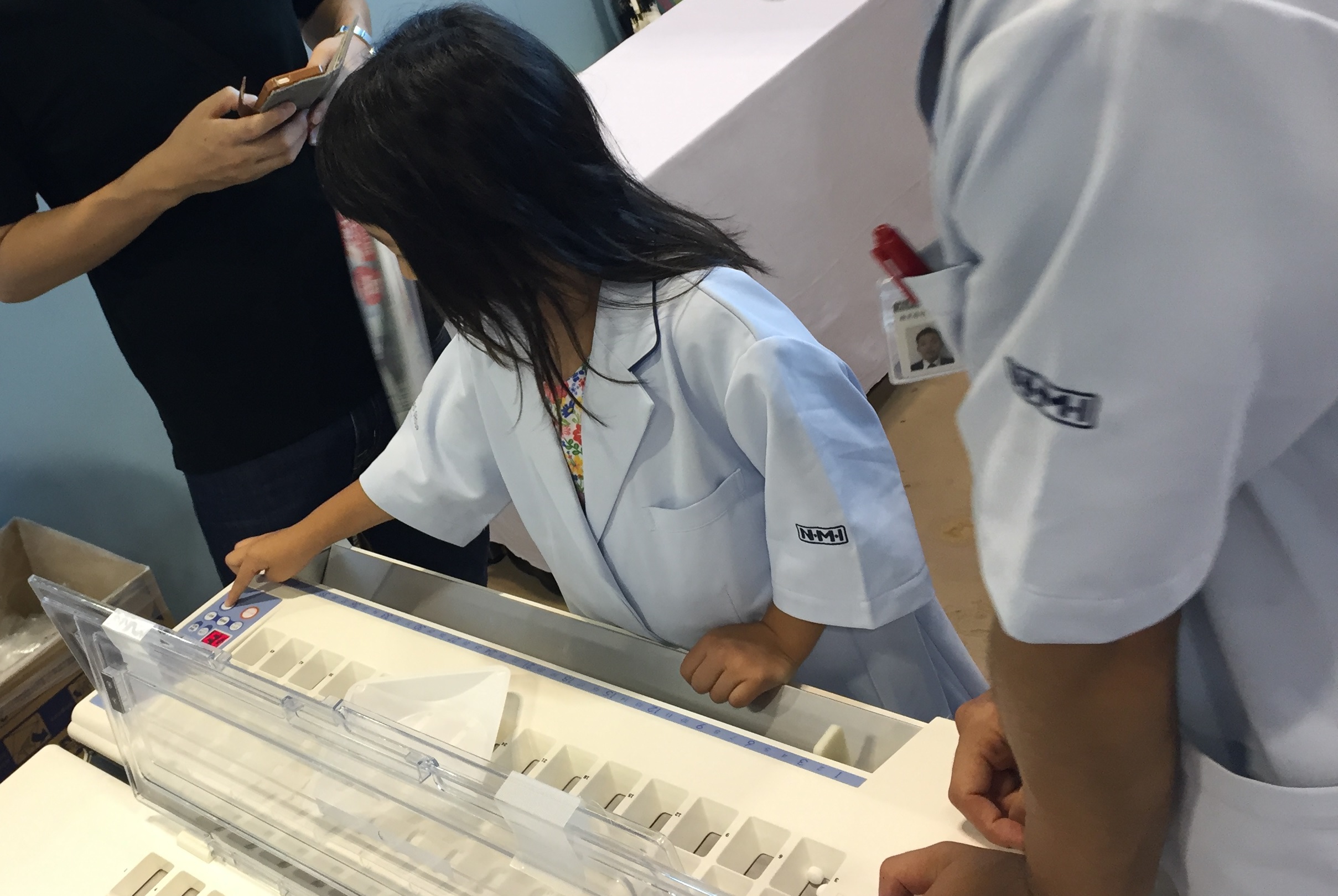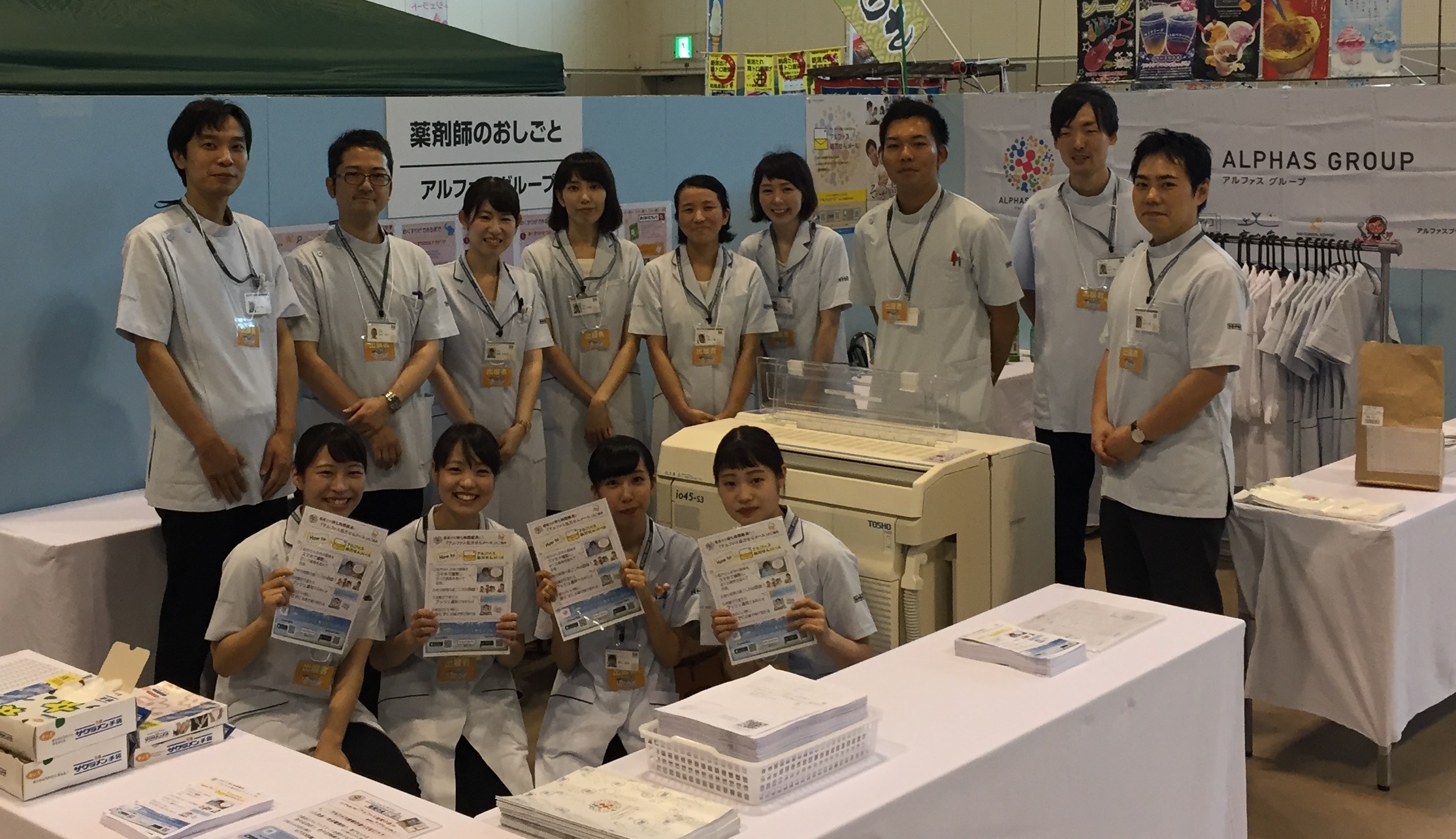 今回はお子様向けのオリジナル白衣「アルファス白衣」も登場し、お薬に見立てたお菓子を一包化(小分け分包)、飲み方の説明体験をしていただきました。2日間で約900人の方にご参加いただき、ブース内は終日たくさんの笑顔が見られました!!