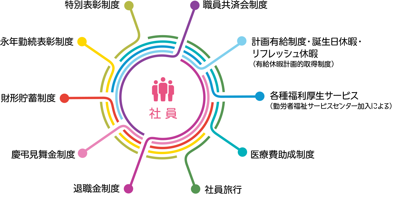 地域に活気を与え、安心をもたらす存在として、社員には常に明るく元気でいて欲しい?。そうした考えから、より快適で、いきいきと働ける環境と、より安らかで、楽しく過ごせるプライベート両面を育む様々な福利厚生制度を用意しています。思い切り遊び、思い切り働く。毎日が満たされることで、個の力も培われていきます。